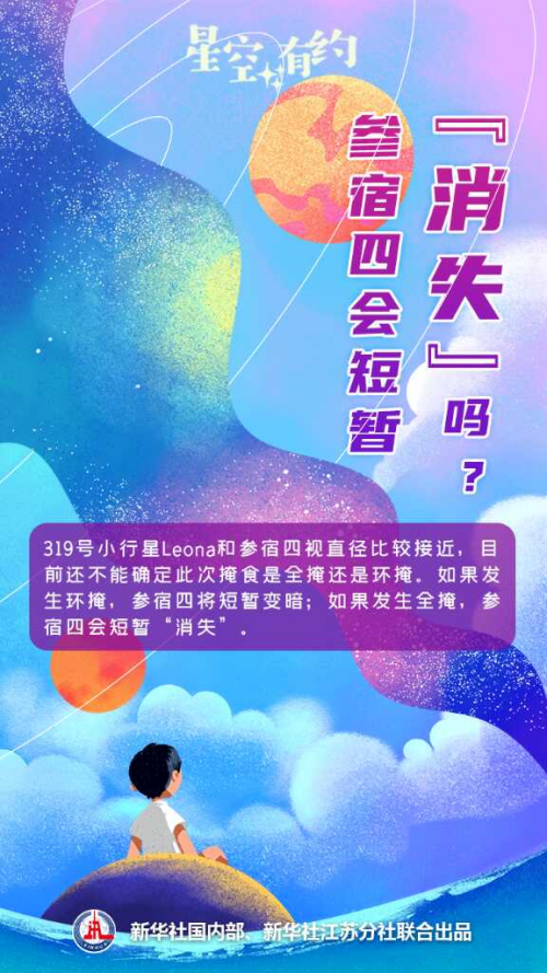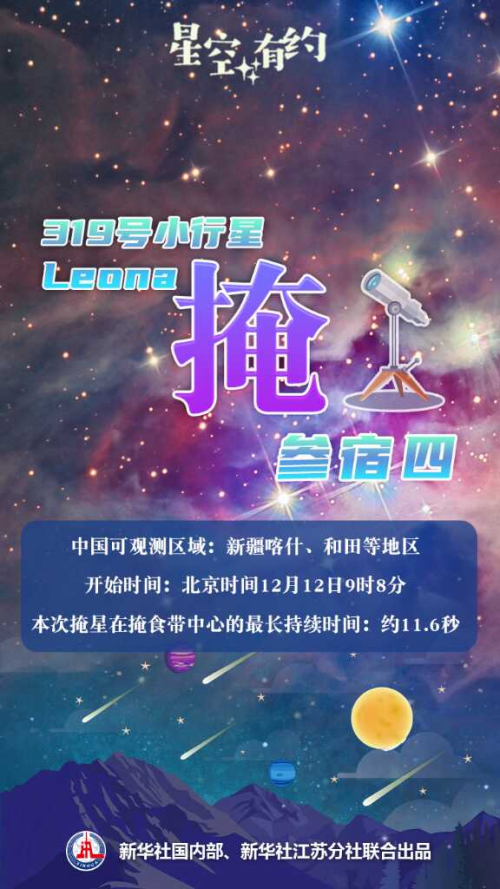 中国科学院紫金山天文台科普主管王科超介绍,北京时间12月12日,319号小行星Leona将掩恒星参宿四。最早能看到本次掩星过程的是中国新疆喀什、和田等地区,开始时间是当日9时8分。本次掩星在掩食带中心的最长持续时间约为11.6秒。