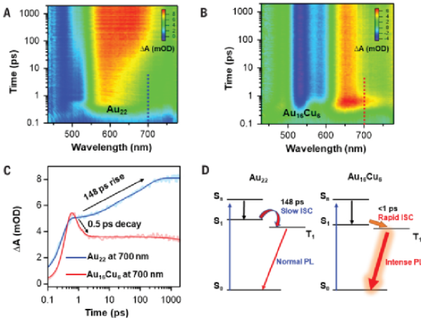 该工作通过瞬态吸收光谱进一步研究两种团簇的激发态动力学,发现两种团簇的发光态均来自于三重激发态(T1),并在飞秒瞬态吸收光谱中观察到不同的动力学过程。在380nm激发下,Au22表现出148 ps的上升过程,而Au16Cu6表现出0.5ps的快速下降过程。研究通过三重态敏化实验证明,这两个过程可归属于S1→T1的系间窜跃(ISC)。铜掺杂使得Au16Cu6具有更小的∆EST,显著加快了其ISC的速率,因此Au16Cu6展现出接近100%的PLQY。
