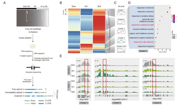 - 光是重要的环境信号,是植物进行光合作用的能量来源,参与调控植物各个阶段的生长发育过程,如种子萌发、幼苗形态建成、叶片发育、茎的伸长与生长、向光性、气孔与叶绿体运动、开花、昼夜节律及避荫反应等。植物幼苗破土见光后,光信号迅速启动,发生光形态建成,即下胚轴生长受到抑制、子叶张开并变绿以进行光合作用。这是植物早期生长的关键阶段。植物在漫长的进化过程中进化出敏感的信号系统来调节光形态建成,以响应不断变化的光环境。前期,中国科学院遗传与发育生物学研究所曹晓风研究组发现,精氨酸甲基转移酶AtPRMT5通过调控mRNA前体的正确加工从而保证植物正常的生长发育。内含子剪切是真核生物mRNA成熟的关键步骤。此前,南方科技大学翟继先研究组发现,植物细胞核内存在大量已完成转录和多聚腺苷酸化的转录本上特定位置的内含子未被剪切的现象,即转录后剪切内含子(pts-intron)。这些转录本会滞留在染色质上,等待内含子剪切完成后才能释放到细胞质中发挥功能。剪切过程依赖于AtPRMT5和SKIP等剪切相关蛋白,并可能在快速响应环境信号变化中发挥作用。然而,关于转录后加工调控在光形态建成中的作用尚不清楚。