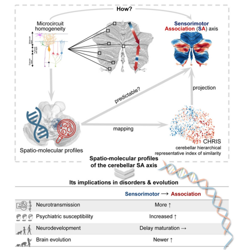 - 人类小脑体积仅为大脑总体积的10%,却包含整个神经系统超过50%的神经元。小脑不仅协调运动,而且影响着人类的思考和情感。在探索小脑功能多样性的过程中,特别是剖析小脑如何参与和影响认知功能和情绪处理,研究发现了一个关键的轴线——感觉运动-联络(SA)轴。这一轴线有助于解释小脑功能层级的复杂性。然而,多数研究集中在探讨人类大脑皮层中SA轴的产生和意义,而鲜有关于小脑上的SA轴是如何形成及其生物学基础的研究。