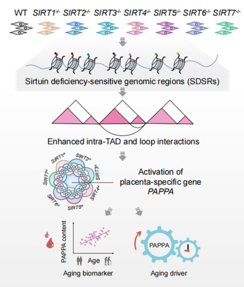 - 考虑到增强子活性的增加可能导致染色质局部接触的重新建立,该工作借助染色质构象捕获测序技术探究了sirtuin蛋白缺失对染色质高级结构的影响,并观察到任何一个sirtuin缺失均会引起染色体内短距离相互作用增加。这种互作增加主要出现在富含SDSR的染色质拓扑结构域内部,导致增强子-启动子染色质环强度增加、二者空间距离拉近,进而诱导一系列基因表达。胎盘特异基因PAPPA是SIRT1-7分别缺失后共性上调表达的基因,其异位表达介导sirtuin蛋白缺失所致的促衰老效应。进一步,研究表明,PAPPA的表达上调是多种类型人类细胞衰老的“共性驱动力”。此外,老年人血浆中PAPPA的蛋白水平显著高于年轻人,提示其可作为度量人类衰老的潜在的生物标志物。