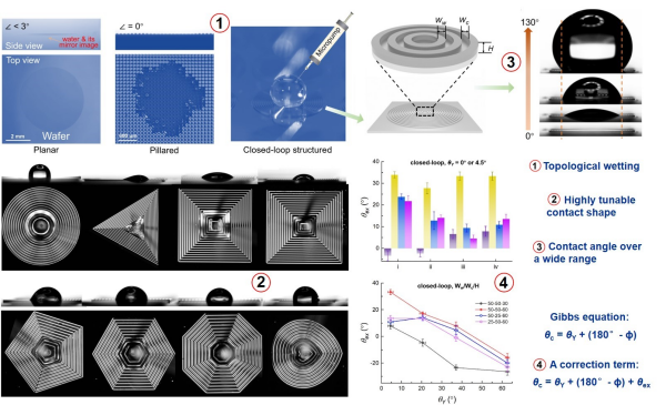 - 该团队在前期提出的“拓扑浸润”概念的基础上,通过光刻技术,制备了一类具有同心闭环微壁/微通道结构的表面,其微壁边缘角精确为90°。研究发现,结合紫外/臭氧处理,该表面的本征接触角达到0°。在这样的闭环结构表面上,研究观察到拓扑浸润现象。这些微液滴展现出多样化的Wenzel态,其三相接触线钉扎在微壁的边缘,接触角可以在较宽范围(0~130°)变化。上述研究提供了全新的微液滴调控手段,能够实现对微液滴尺寸、形状和接触角的精准调控。这一调控方法的特色在于全方位、大尺度的调控能力。通过设计同心微壁的形状,可以有效地控制液滴接触面积的大小和形状,如圆形、三角形、正方形、矩形、五边形、六边形、八边形和十二边形,甚至是不规则的心形,并适用于多种液体。