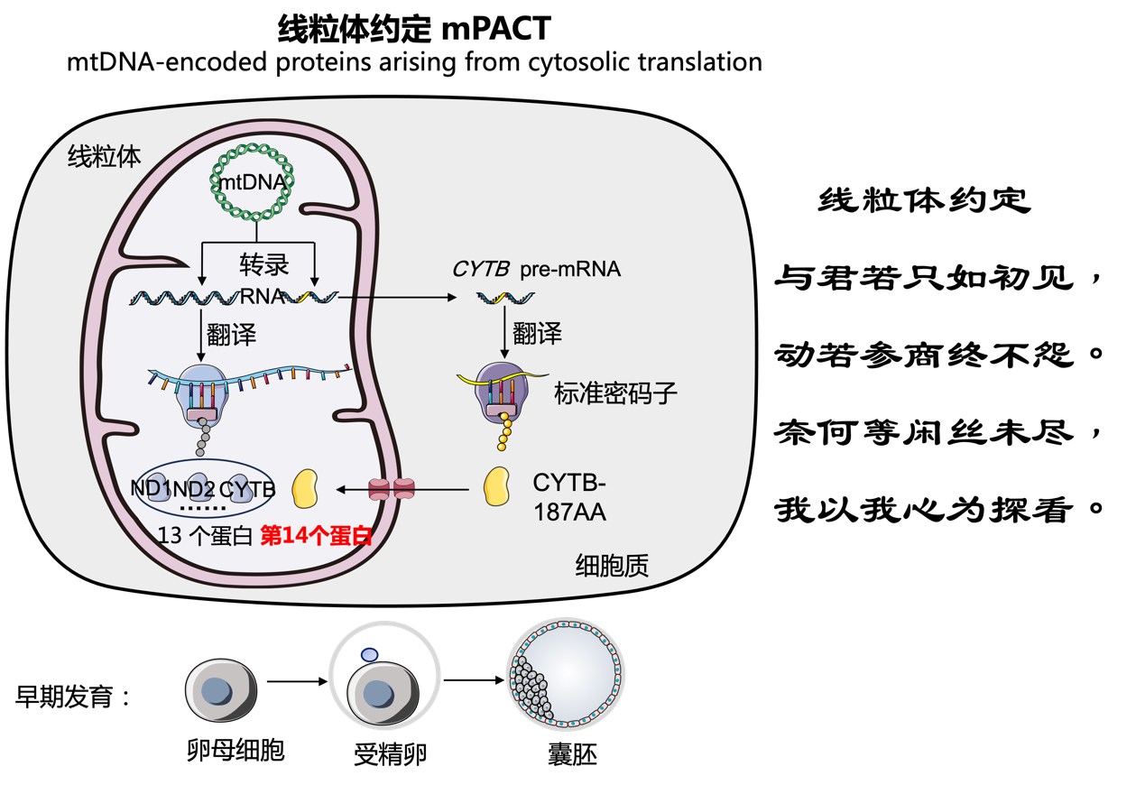- 该研究发现了线粒体基因组上编码复合物III中CYTB基因可以使用胞质核糖体的标准遗传密码编码第14个全新蛋白质;解析了线粒体基因CYTB的双重翻译模式,即母蛋白CYTB与CYTB-187AA展示了线粒体能量的双重调控模式。与在呼吸链复合物III中的CYTB蛋白相比较,线粒体基因编码的第14个蛋白质CYTB-187AA与SLC25A3相互作用,调节能量过程,在卵子发育、着床前后等阶段发挥重要作用。