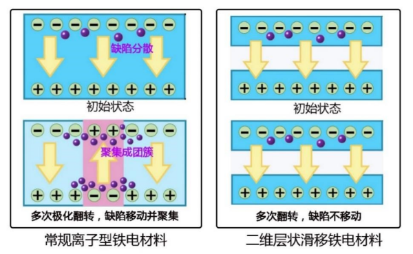 - 常规铁电材料和二维滑移铁电材料疲劳特性对比