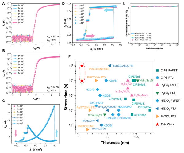 - 该研究以双层MoS2二维材料为代表性材料,采用化学气相输送法制备出双层MoS2铁电器件。在百万次循环电场翻转极化后,铁电极化并未发生衰减,这提示该铁电器件的抗疲劳性能优于传统离子型铁电材料。研究发现,以存储器为例,使用新型二维滑移铁电材料制备的铁电存储器无读写次数限制。因此,无疲劳的新型二维层状滑移铁电材料有望提升设备可靠性,降低维护成本。