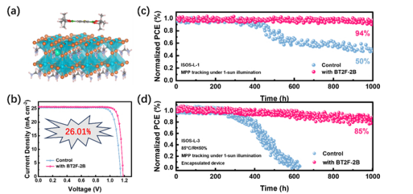 - (a)钙钛矿吸附BT2F-2B后的电子密度分布;(b)反式钙钛矿太阳能电池器件效率;(c)ISOS-L-1和 (d)ISOS-L-3协议下,钙钛矿太阳能电池的运行稳定性