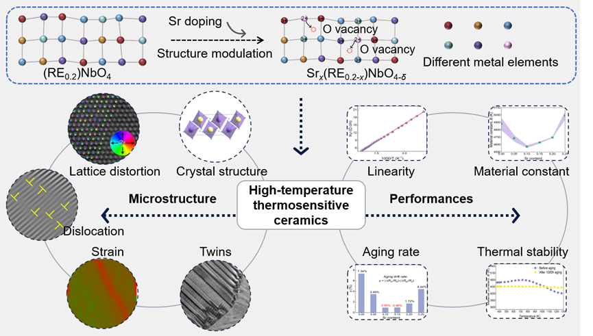 - 中国科学院新疆理化技术研究所科研人员基于氧空位调控机制,开发出具有褐钇铌矿结构的稀土铌酸盐(RENbO4,RE为稀土元素)高熵热敏陶瓷材料,创新性地提出熵工程协同异价取代策略。该策略通过多元稀土离子A位引入导致的熵稳定效应与Sr2+异价掺杂的协同作用,提升了氧空位浓度,优化了材料的电子传输特性和晶格稳定性。研究显示,氧空位诱导的熵稳定机制可同步调控材料微结构,形成孪晶畴、晶格畸变与动态重构等稳定特征,强化了温度-电阻响应的线性度和高温服役稳定性。