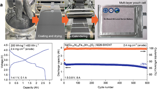 - 基于这个策略,研究制备出的微米锡负极在0.1 A/g下具有789.4 mAh/g的高可逆容量,并在2 A/g的大电流下循环6000次后,容量保持率仍达87.6%。基于公斤级放大制备的微米锡负极,研究制备了安时级钠离子电池,实现了超过453 Wh/L的高体积能量密度,并在4C倍率下实现稳定循环。此外,该电池还展现出优异的低温性能,综合指标优于商业磷酸铁锂电池。