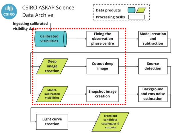 - 图1. ASKAP瞬态检测管线的数据处理过程是从ASKAP原始可见度数据在线处理到瞬态检测,再到最终生成瞬态目录。
