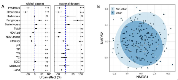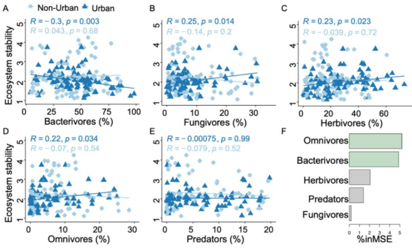 中国科学院城市环境研究所朱永官院士团队孙新研究组,在中国12个城市对城市-城郊的土壤线虫功能群相对数量与生态系统稳定性的关系进行了调查研究。同时,该研究对相关结论进行了全球尺度数据的验证。结果表明,城市化降低了土壤杂食性和捕食性线虫的相对数量,增加了食细菌和食真菌线虫的相对数量 (图1a),并使其群落结构更加同质化(图1b)。相对城郊土壤,仅城市食细菌、食真菌、植食性和杂食性土壤线虫相对数量与生态系统稳定性的关系呈现显著,同时,杂食性和食细菌线虫是生态系统稳定性的主要贡献因子(图2)。因此,本研究建议,在制定城市土壤生物多样性保护战略时,需考虑不同功能群的特点,增加生境的多样性,同时,需要优先制定高营养类群的保护措施,特别是杂食性的类群。